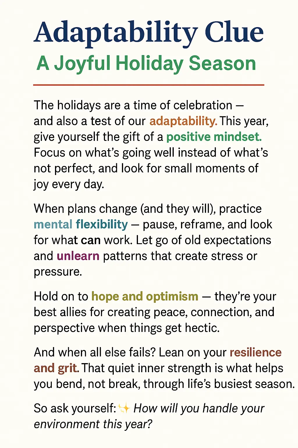 The holidays are filled with celebration, warmth, and a good amount of chaos. That’s why Adaptability Intelligence (AQ) becomes your secret superpower during this time of year. It’s what helps you stay steady when plans shift, emotions run high, or things simply don’t go the way you imagined. Start with